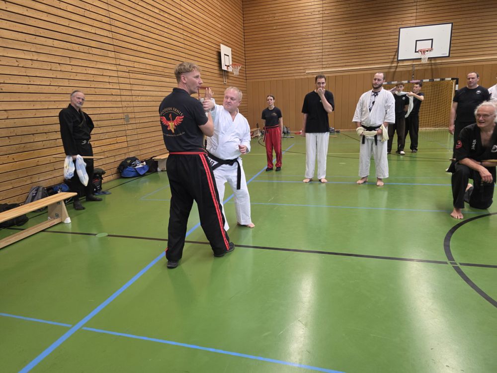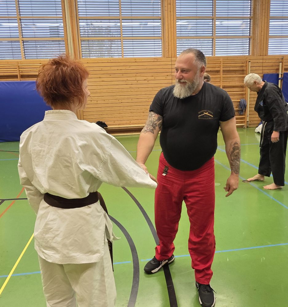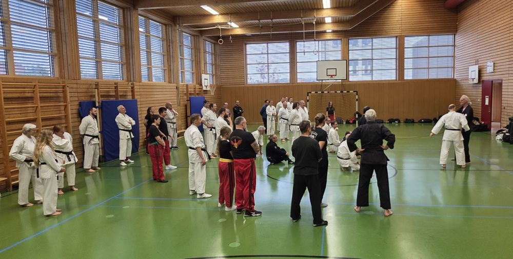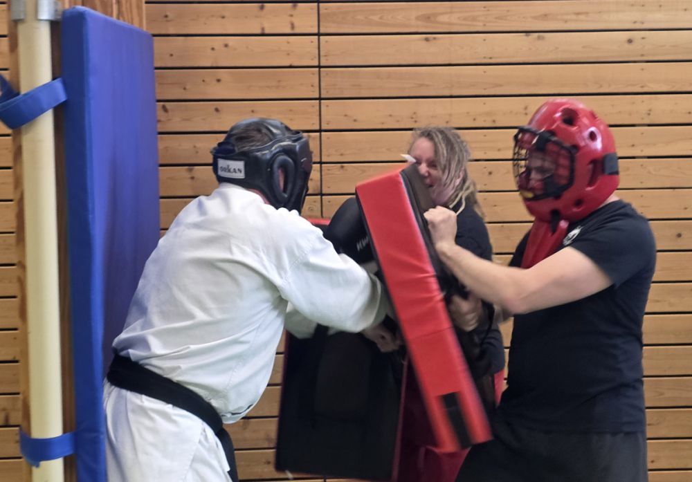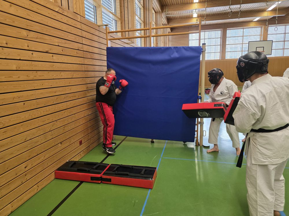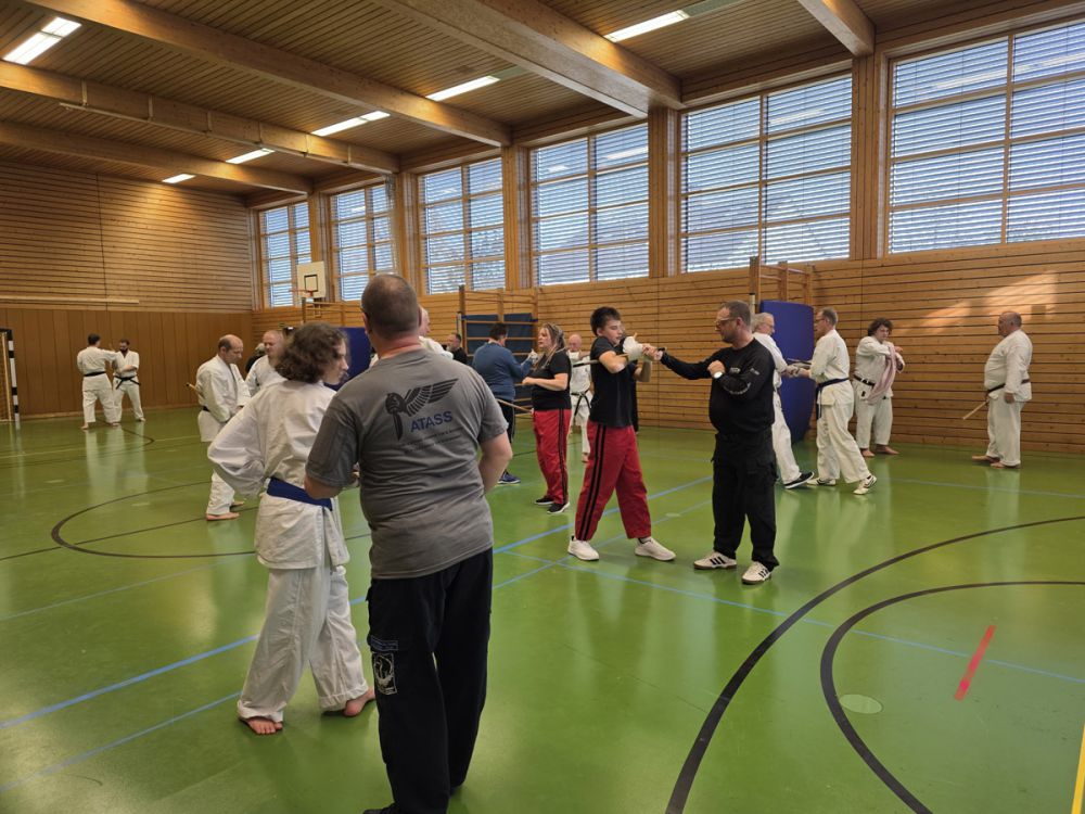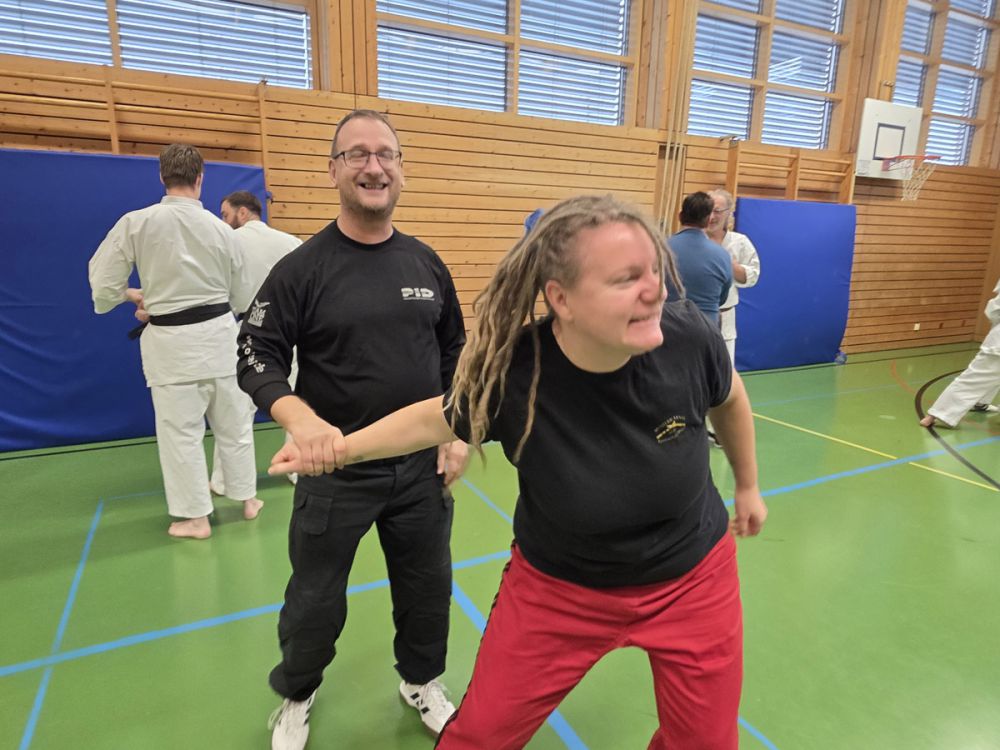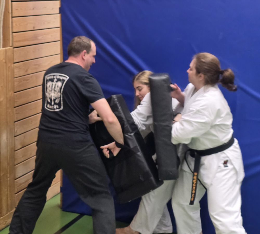 Am 25.10.2025 fand der Streetdefense-Lehrgang Vol. 8 in der Schulturnhalle in Pilsach statt. Los ging es mit der Trainingseinheit von Norbert Beyerlein, in welcher es um Grundschule und Befreiungstechniken aus dem Karate ging. Danach führte Alfred Heubeck das Thema weiter und zeigte uns verschiedene Folgetechniken wie etwa Hebel und Würfe. Im Anschluss demonstrierte Ingolf Richter Techniken gegen Angriffe an der Wand, wobei dann allen die Überschrift seiner Einheit "die Wand mein Freund" schnell neue Erkenntnisse brachte. Denn es kann durchaus sehr hilfreich sein, eine Wand im Rücken zu haben.