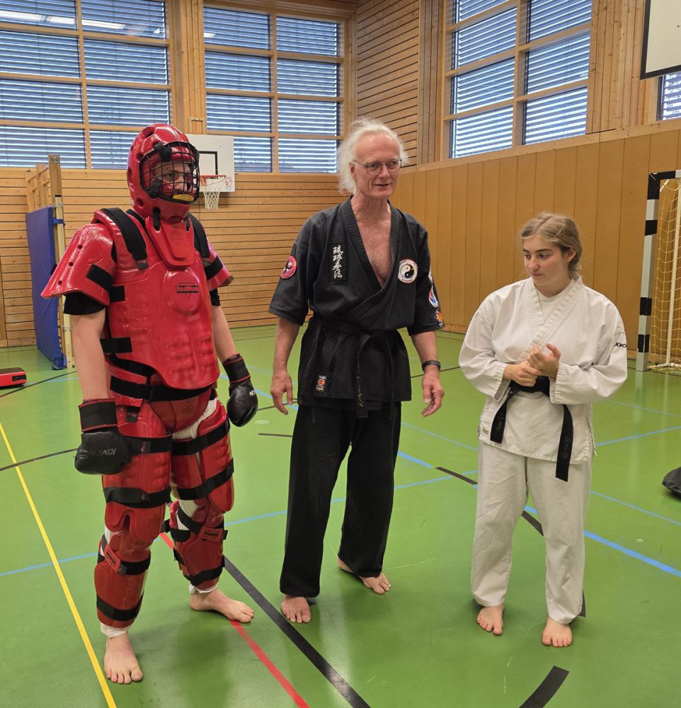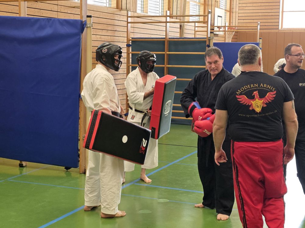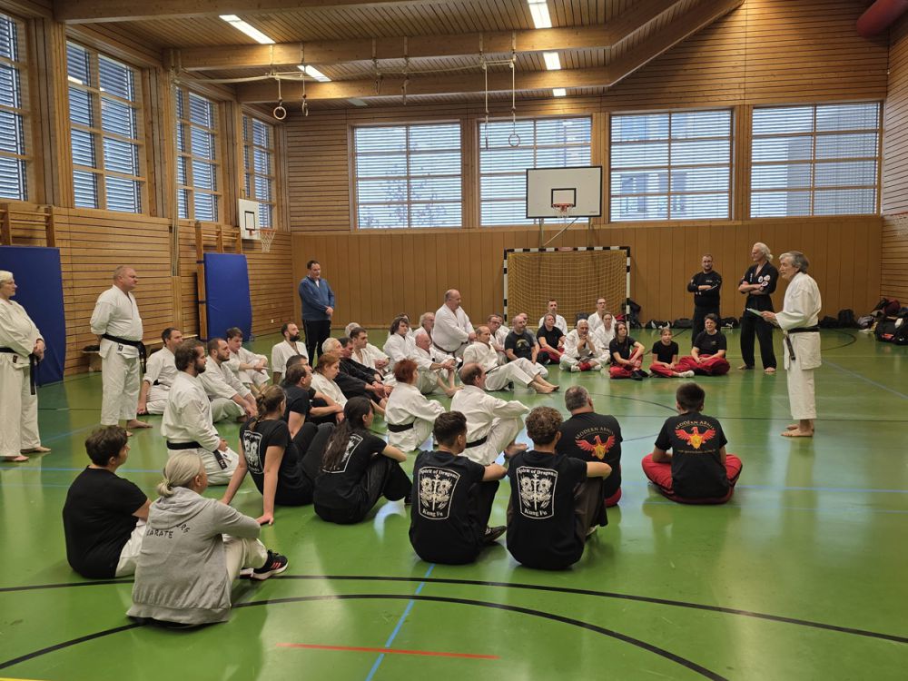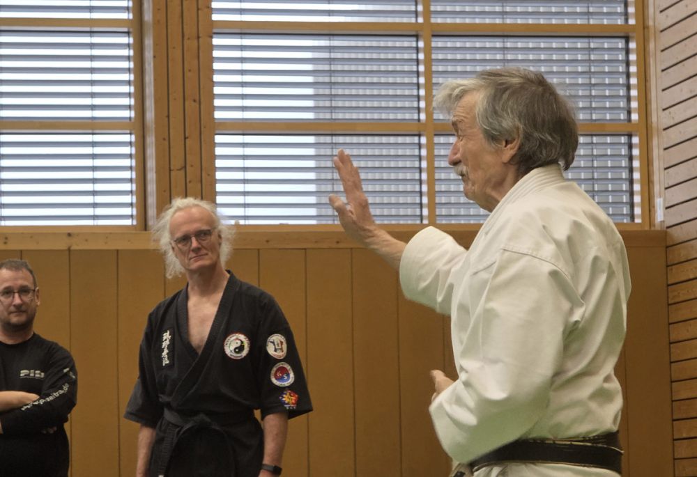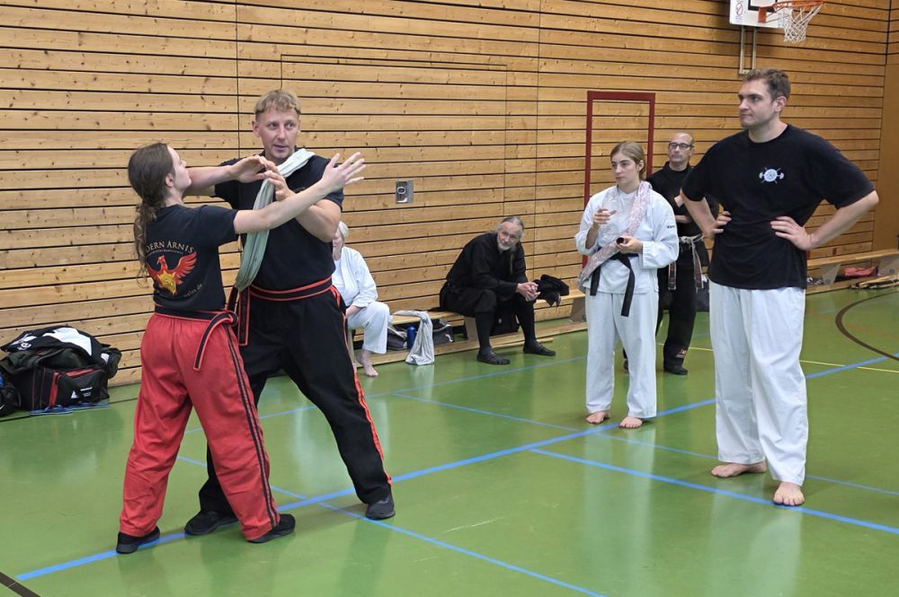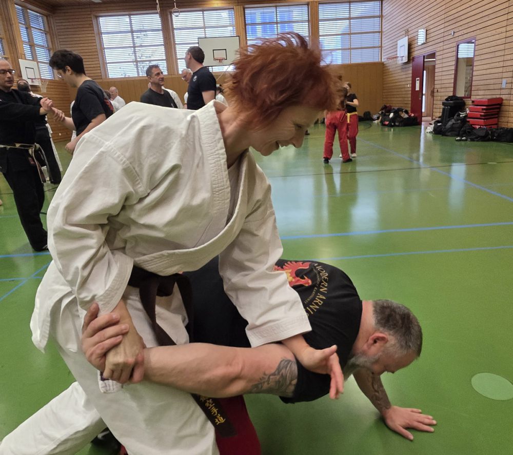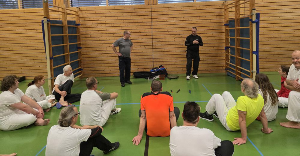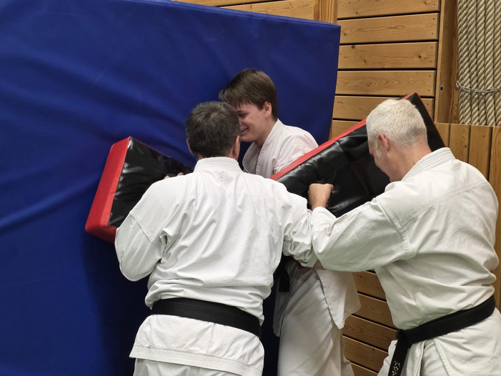Am 25.10.2025 fand der Streetdefense-Lehrgang Vol. 8 in der Schulturnhalle in Pilsach statt. Los ging es mit der Trainingseinheit von Norbert Beyerlein, in welcher es um Grundschule und Befreiungstechniken aus dem Karate ging. Danach führte Alfred Heubeck das Thema weiter und zeigte uns verschiedene Folgetechniken wie etwa Hebel und Würfe. Im Anschluss demonstrierte Ingolf Richter Techniken gegen Angriffe an der Wand, wobei dann allen die Überschrift seiner Einheit "die Wand mein Freund" schnell neue Erkenntnisse brachte. Denn es kann durchaus sehr hilfreich sein, eine Wand im Rücken zu haben.
