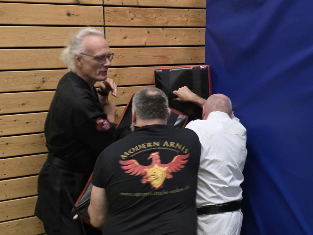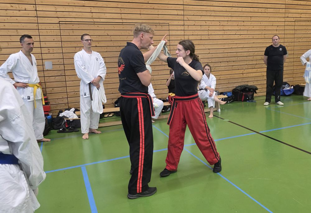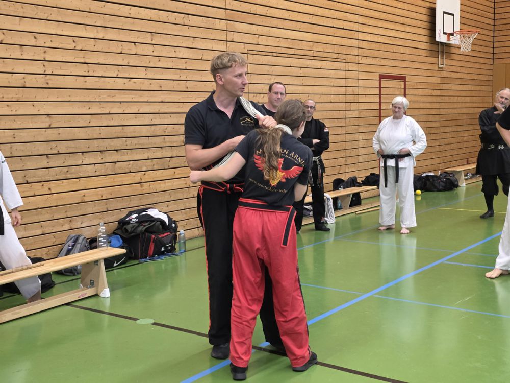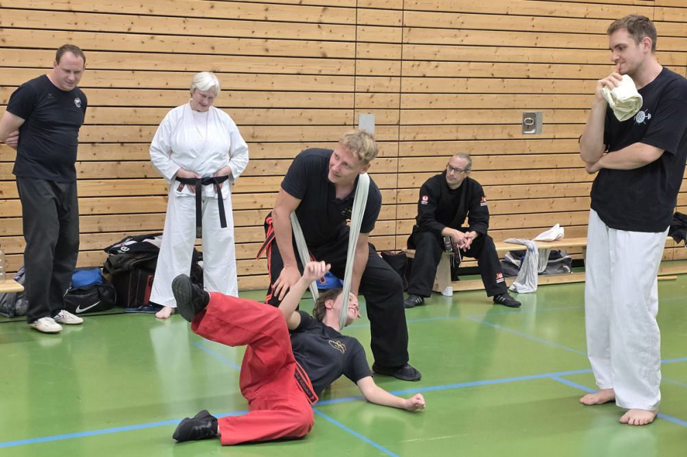 Nach der Mittagspause startete Markus Waßmann mit seiner Einheit "Stand vs. Boden" in die zweite Hälfte des Lehrgangs und vermittelte sein Wissen über die Verteidigung und Angriffsstrategien am Boden. Als nächstes Thema stand "SV mit flexiblen Gegenständen" auf dem Plan, wo Sebastian Wales den Teilnehmern Abwehr- und Folgetechniken wie Würgetechniken und Würfe mit dem Sarong zeigte. Dabei ist der Sarong ein Platzhalter für z.B. Handtaschen, Gürtel oder Schals.