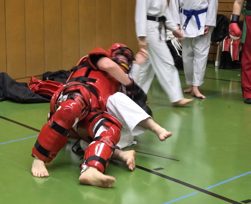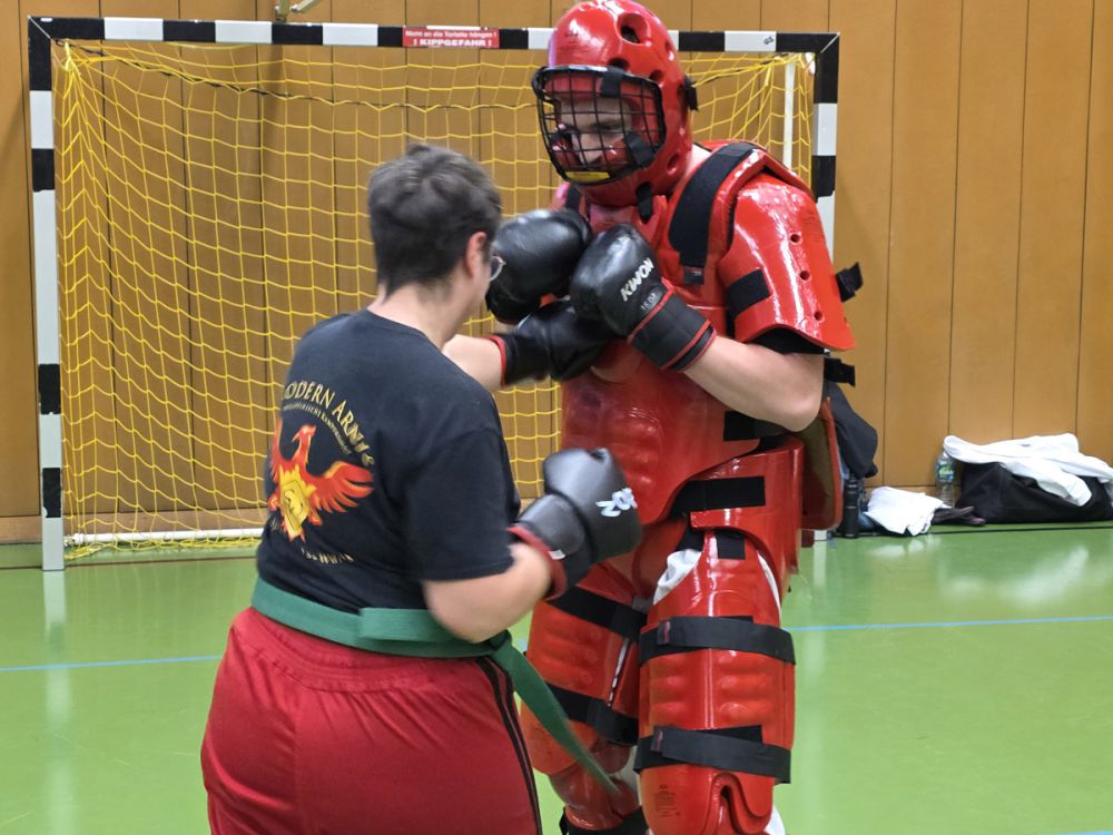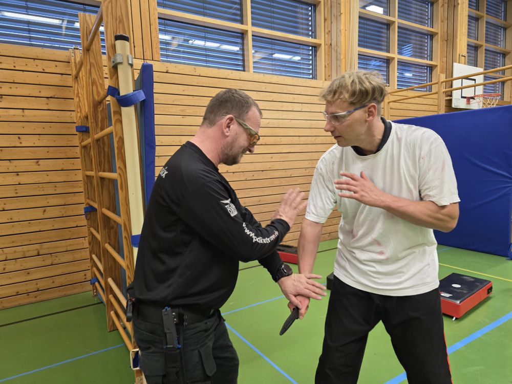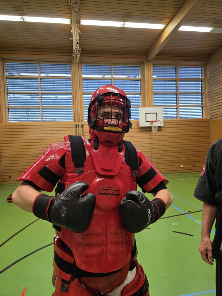 Als letzte Einheit konnten die Teilnehmer zwischen Kampf gehen einen Vollschutzanzug (RedMan) und Kampf mit Markierungsmessern wählen. Beim RedMan können die erlernten Techniken mit voller Power durchgeführt werden. Bei den Markierungsmessern ging es darum, die Abwehr gegen Messerangriffe zu verbessern und vor allem zu sehen, ob die angewandten Techniken auch gut funktionieren.